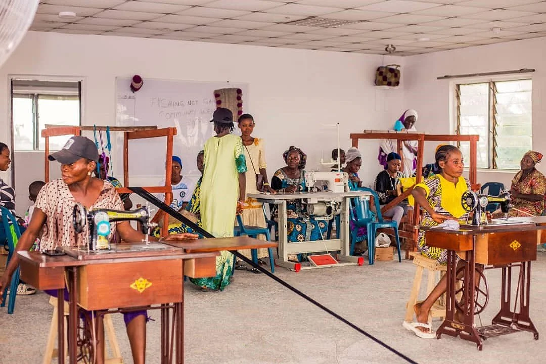 The Fishing Net Gains Community Integrated Center project, led by the SOFER Initiative, made significant progress in 2024. As part of this project, the SOFER Initiative recruited 16 local ghost gear retrievers, who successfully recovered 1,919 kg of waste fishing gear across eight coastal communities in Nigeria. Additionally, 25 women from the local community were trained to convert fishing gear into fabric at the Community Integrated Centre (CIC). The CIC serves as a multifunctional facility: a hub for fabric production; a welfare center; and a cooperative space for fishermen, women, fish processors, and traders. The facility also functions as a training center for fabric production.